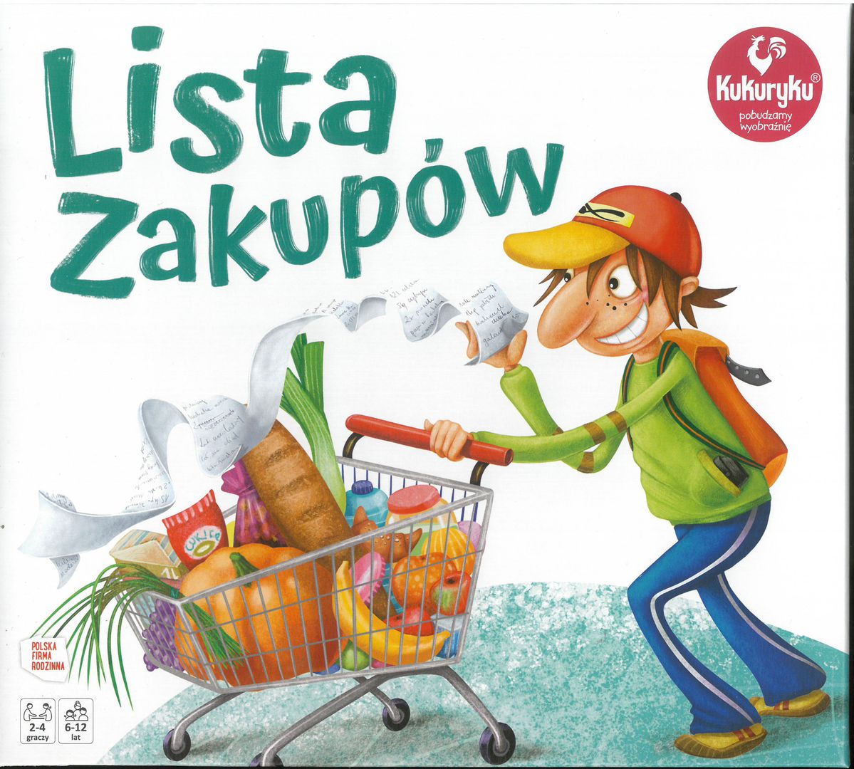 Lista zakupów. - Częstochowa : Kukuryku ; 2020. - 1 gra (60 tafelków produktów, 4 listy zakupów, 18 kart przygód, 80 kart banknotów , 4 pionki i kostka, plansza) : papier, karton, kolor ; w pudełku 25x22x5 cm + instrukcja (6 stron ; 19 cm).
