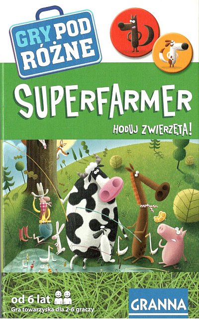 Superfarmer : hoduj zwierzęta! / autor gry: Karol Borsuk ; ilustracje: Piotr Socha. - Warszawa : Granna, © 2015. - 1 pudełko (2 dwunastościenne kostki, 128 kartoników z obrazkami zwierząt, instrukcja) : ilustracje ; 19x12x4 cm.