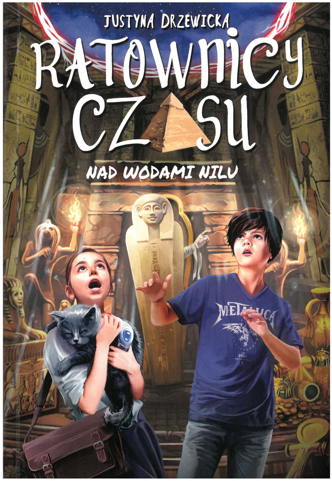 Drugi tom cyklu RATOWNICY CZASU, w którym bohaterowie przenoszą się do starożytnego Egiptu Pełna humoru i subtelnie podanej wiedzy historycznej opowieść o podróży w czasie. Książkę wzbogacają humorystyczne, komiksowe rysunki autorstwa Jędrzeja Łanieckiego oraz atrakcyjnie wyróżnione przypisy z mnóstwem ciekawostek i interesujących faktów ze starożytnego Egiptu. Bohaterowie serii to dwójka współczesnych trzynastolatków, Sara i Daniel, którzy zostają zabrani w podróż do przeszłości przez sympatycznego nicponia z 2118 roku. Można by go nazwać humanoidem, gdyby nie to, że ma postać kota o osobowości na pół kociej, na pół „nastoletniej”. To nie działanie czarów – podróż w czasie jest możliwa dzięki technologii z czasów kota. [lubimyczytac.pl]